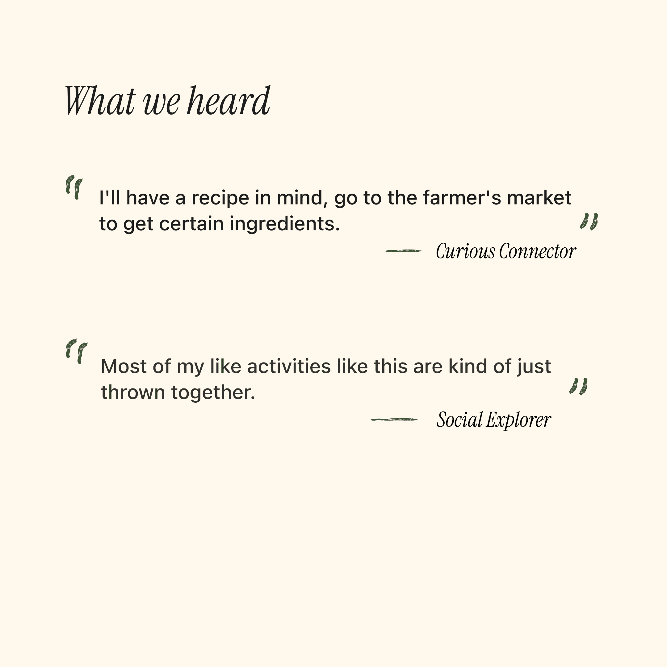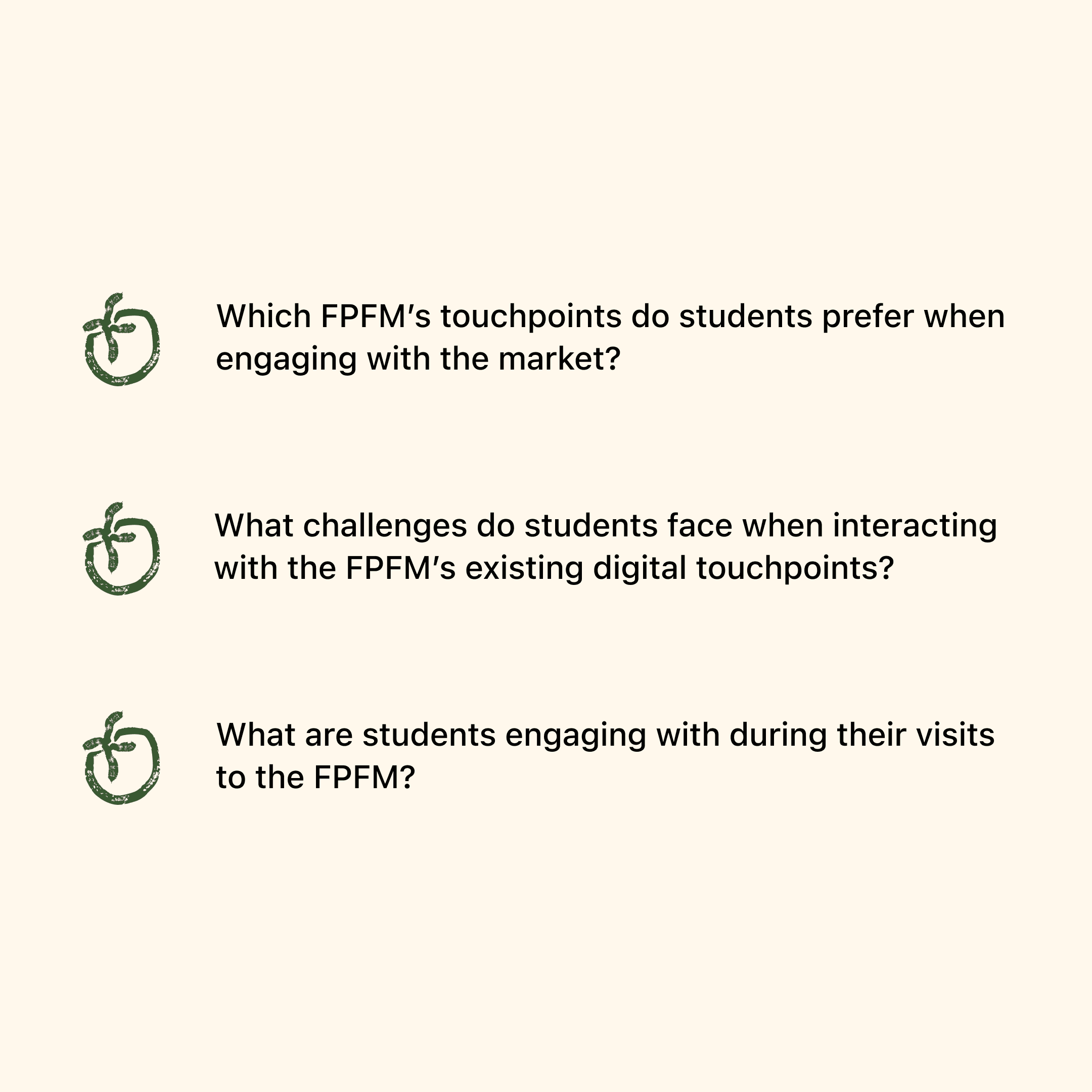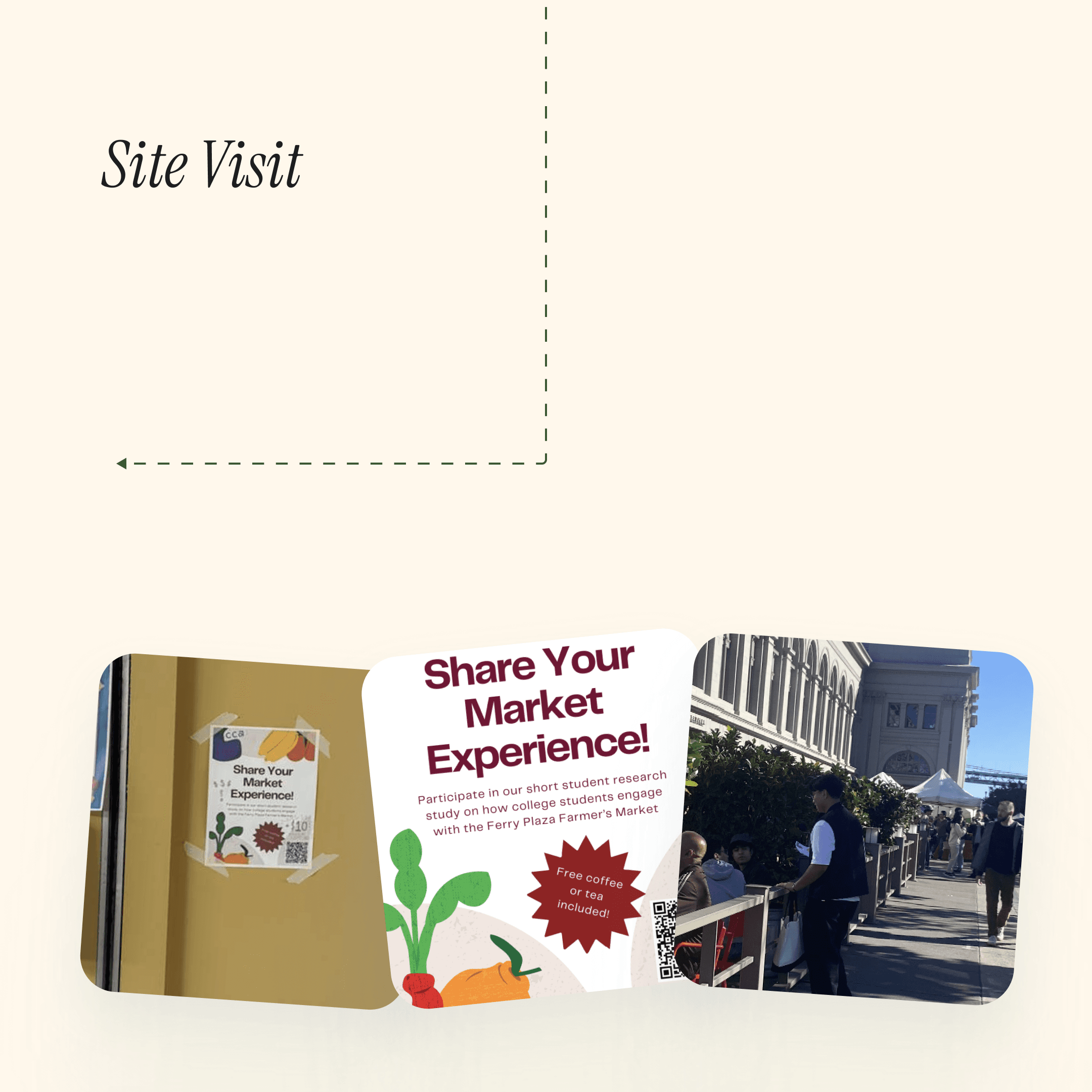 Produce Posse examined how students aged 18-23 engage with the Ferry Plaza Farmers Market. Through interviews and fieldwork, we explored how atmosphere and novelty drive visits—while lack of real-time information prevents regular attendance.