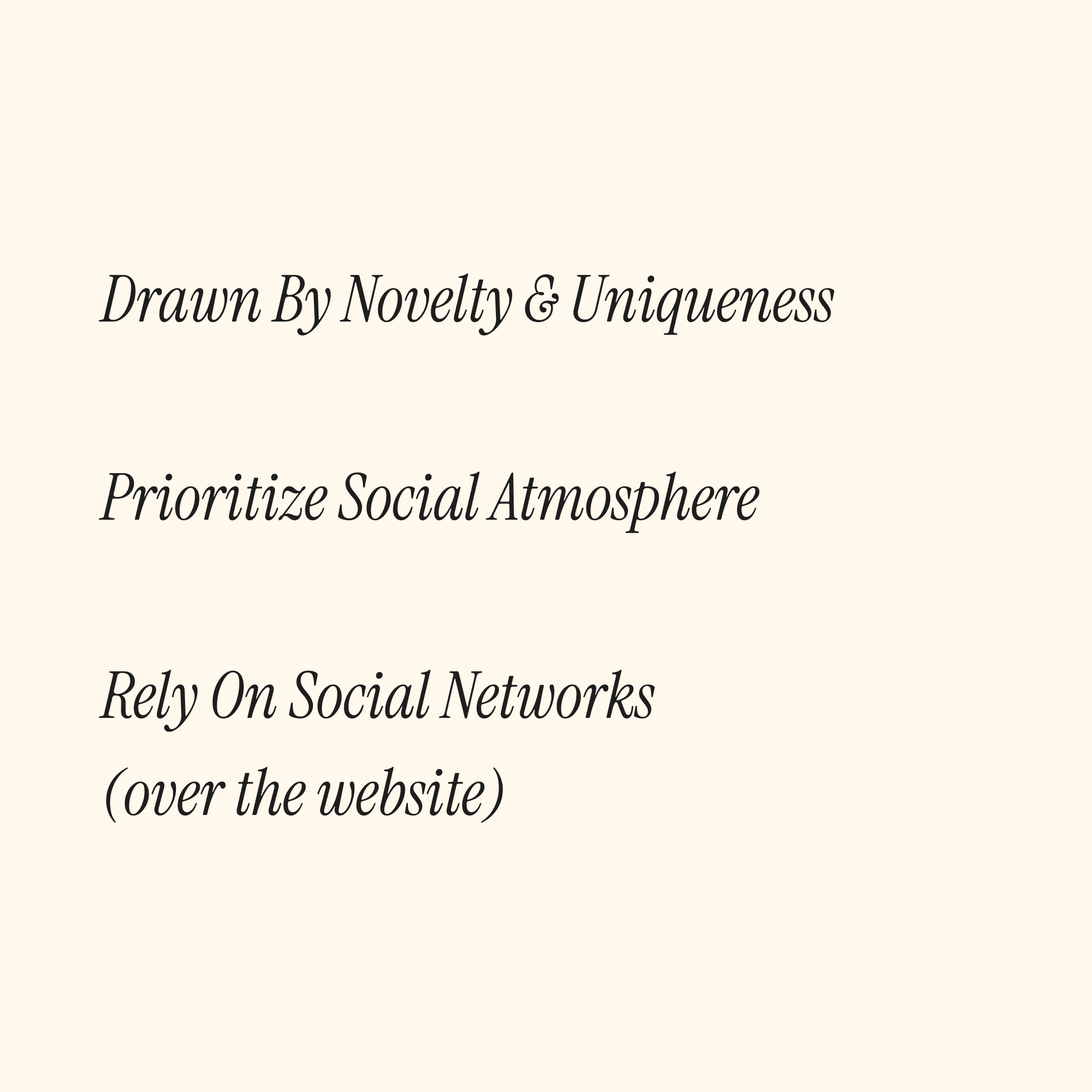 Students visit when drawn by novelty, uniqueness, or time-limited experiences. They prioritize the market's social atmosphere over groceries, rely on social networks rather than its website, and stay engaged through vendor interactions and environmental cues.